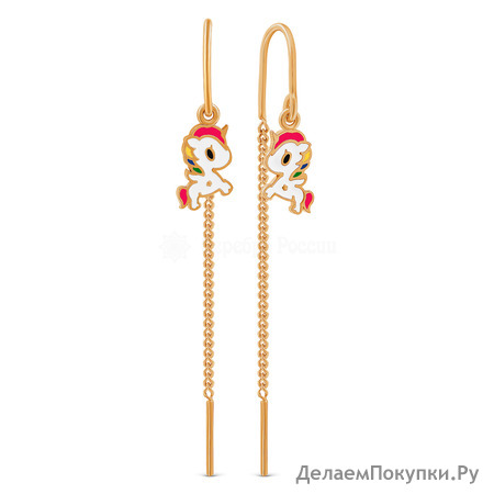 Серьги-продёвки детские из золочёного серебра с эмалью - Единорожки